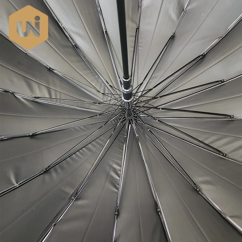 Paraguas adulto ULTRAVIOLETA del palillo de 16k Marco y eje de fibra de vidrio, mango de goma, tela estampada con revestimiento negro pongee, tela sólida resistente al agua. |